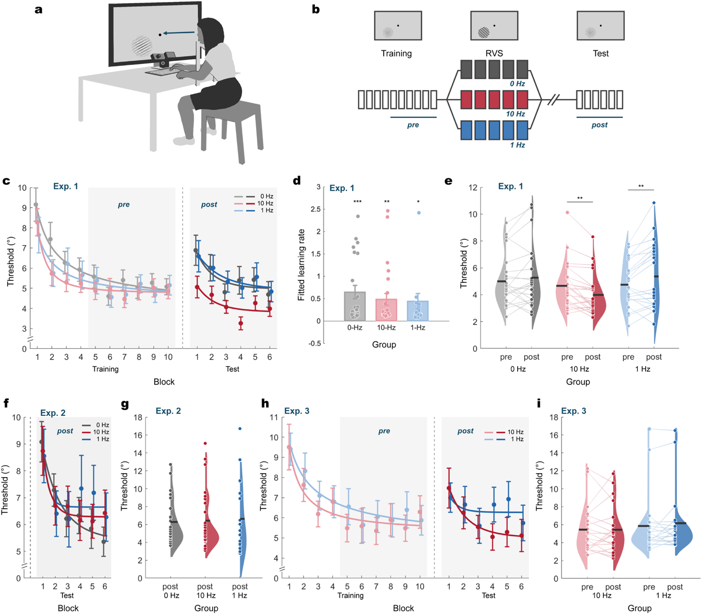 图1 主要行为结果。朝向辨别的阈值在10Hz闪烁干预后下降,在1Hz闪烁干预后上升。