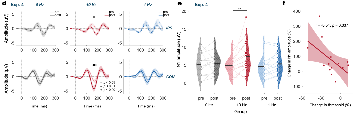 为了进一步揭示这一调控作用背后的神经机制,研究团队采用了事件相关电位(ERP)和磁共振波谱(MRS)两种技术,分别从神经电生理和神经化学的角度观察大脑的变化。ERP 结果显示,10 Hz 刺激增强了视觉皮层的 N1 成分——这是大脑对视觉信息早期加工的特征指标,并被认为与朝向辨别功能相关。与此同时,MRS 结果则揭示,10 Hz 刺激提升了视觉皮层中谷氨酸/谷氨酰胺(Glu/Gln)与γ-氨基丁酸(GABA)的比例,即兴奋性与抑制性神经递质的平衡朝着“更易形成学习痕迹”的方向偏移。这些证据共同指向一种类似长时程增强(LTP-like)的可塑性变化,说明闪烁光不仅影响行为表现,更直观地重塑了大脑的早期感知系统。