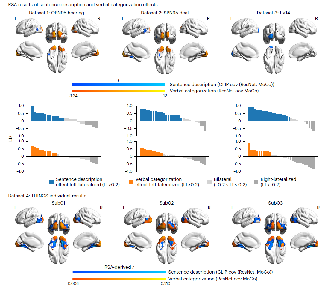 在健康人群部分,研究在四套独立 fMRI 数据中重复检验上述效应,包含口语命名(OPN95, n=26)与手语命名(SPN95, n=32)、颜色知识判断(FV14, n=33),以及公开数据集 THINGS 的 Oddball 检测任务(n=3)。结果显示,四个数据集中均可观察到句子描述效应在 VOTC 的显著簇;其中,在样本量较大的三套自建数据中,该效应表现出群体水平上的显著左偏,与语言网络的典型偏侧化分布方向一致。值得注意的是,口语命名(听人)与手语命名(先天重度听障的手语使用者)之间,该效应无显著差异,提示其并不依赖听觉经验或语言输入模态本身。