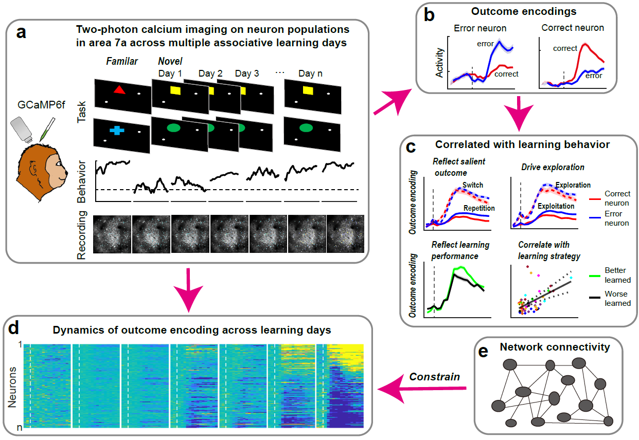 2025年11月27日,北京大学心理与认知科学学院、IDG麦戈文脑科学研究所及生命中心周阳课题组在《Nature Communications》发表题为《Neural correlates of trial outcome monitoring during long-term learning in primate posterior parietal cortex》的研究成果,揭示了其中的关键机制。研究团队利用双光子钙成像技术,对参与多日连续关联学习任务的猕猴后顶叶皮层7a区神经活动进行跨天追踪,发现该脑区存在对行为结果的显著神经表征,并且这些表征紧密追踪动物的学习行为。此外,当新的关联学习开始时,这些结果表征会迅速重组,并在后续的学习过程中逐渐演化,而这一演化过程受到局部神经网络功能连接结构的限制。