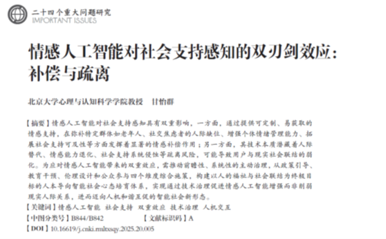 近日,北京大学心理与认知科学学院甘怡群教授在情感人工智能(Affective AI)的社会心理效应研究领域取得重要理论进展,相关成果《情感人工智能对社会支持感知的双刃剑效应:补偿与疏离》于国内权威学术期刊《人民论坛·学术前沿》正式发表。