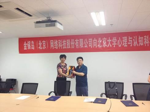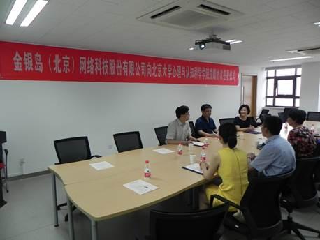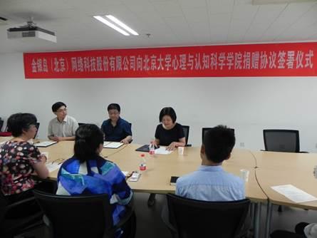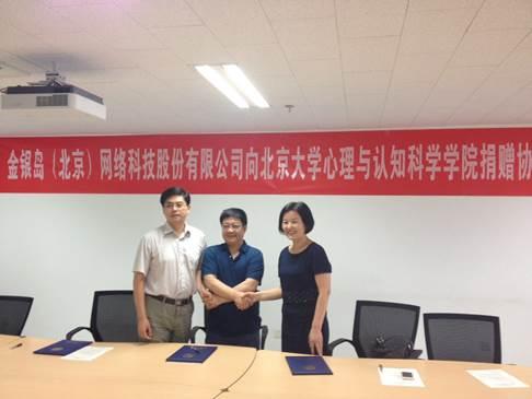 2016年7月14日,金银岛(北京)网络科技股份有限公司向北京大学心理与认知科学学院捐赠协议签署仪式在北京大学王克桢楼1115室顺利举行,北京大学校长助理、教育基金会秘书长邓娅老师,A级人才计划专家团队代表、校团委书记陈永利老师,心理与认知科学学院院长方方教授,A级人才计划专家团队代表、心理与认知科学学院王垒教授,院党委副书记魏巍老师等师生代表与北京大学心理与认知科学学院87级院友、金银岛(北京)网络科技股份有限公司创始人、董事长王宇宏学长一同出席捐赠仪式。仪式由北京大学心理与认知科学学院党委书记、主管教学副院长吴艳红教授主持。