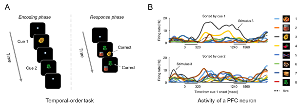 前额叶是灵长类尤为发达的脑区,它和内侧颞叶在时序记忆(时间顺序记忆)中的作用颇有争议。在本研究中,纳家勇治研究组对前额叶神经元在时序记忆任务中的活动模式进行了探究,并与内侧颞叶区神经元进行了比较。在实验任务中,猴需要记住两个依次呈现的物体的身份和时序信息(编码阶段),并在随后的测试中“告知”研究人员(回忆阶段)这些信息。研究发现,在编码阶段,前额叶表征了特定的物体身份和时序的组合,并且有显著的物体选择性延时活动。相对地,内侧颞叶表征了受时序信号和递增时间信号调制的物体信息。因此,虽然前额叶、内侧颞叶两个脑区的神经元都表征了物体的身份、时序或两者的组合信息,但是它们的编码策略迥异。前额叶的神经元表现出对物体身份和时序更为独立的选择性,提示其可能以非线性算法整合任务相关的变量,从而表征更高维的信息,为解决多样的任务提供计算优势。而内侧颞叶则稳定地表征物体及其搭载的时间信息,实时编码我们正在经历的场景,为后续的记忆提取做准备。
