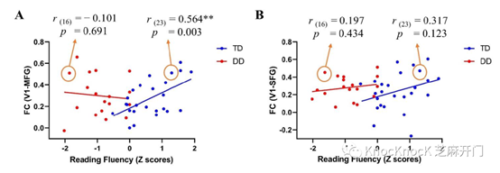 研究进一步计算了初级视觉皮层(V1)和全脑之间的静息态功能连接,并且在典型发展组和阅读障碍组中分别考察了该静息态功能连接与视知觉加工和阅读流畅性之间的相关。