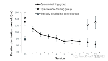 我们在听觉知觉学习(实时距和空时距)中也发现阅读障碍者差别阈限更大,而且在两个任务上的差距基本是一致的,都是比典型发展儿童长了50毫秒左右(图6)。而经过短时间的自适应式训练,阅读障碍组这个粗糙(coarse)、不够精细(fine)的差别阈限就得到了提升(图7)。