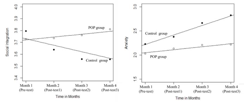 图2 大学新生入学后的社交融入和焦虑随时间变化的组间差异比较