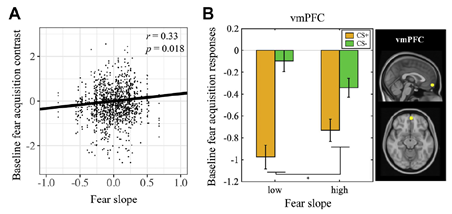 Fig.3(A)较高的恐惧获得阶段对威胁刺激(CS+ vs. CS-)的基线神经激活水平与未来30个月中 “恐惧“特征的增长斜率呈正相关;(B)腹内侧前额叶皮层(vmPFC)体现出了最强的效应。