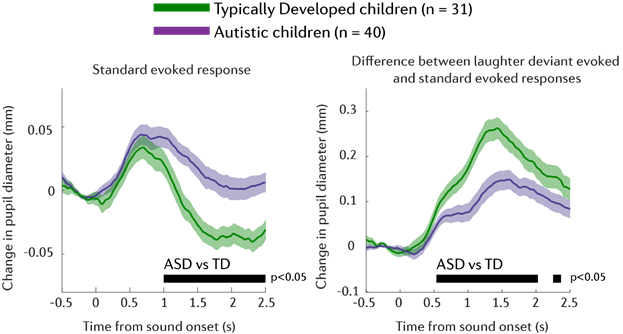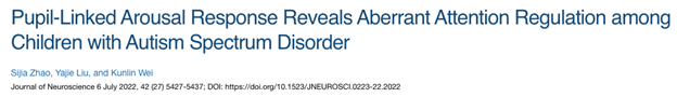 魏坤琳教授课题组的研究生刘雅洁利用实时的瞳孔大小测量来间接测量蓝斑核的活动,并在青岛以琳孤独症儿童学校完成行为学实验。研究结果表明,与年龄及智商匹配的正常发育儿童相比,孤独症儿童的瞳孔在单调重复的声音刺激下没有充分变小;而当听到出乎意料的新异声音刺激时,他们的瞳孔没有充分变大。并且,这些异常和孤独症核心症状的严重程度之间直接相关。因为瞳孔大小可以实时反映蓝斑核的活动强度,这些结果表明蓝斑核为主导的去甲腺上素注意调控在孤独症儿童中出现异常,而这些异常可能和孤独症的发展相关。特别值得注意的是,本研究发现的孤独症儿童注意力异常是在不涉及认知任务的情况下发现的,这就意味着孤独症儿童在日常的缺省状态下其注意力调制就异于常人。该研究对孤独症的成因和认知机制有重要的揭示作用,对孤独症儿童的干预和教育也有一定的指导意义。
