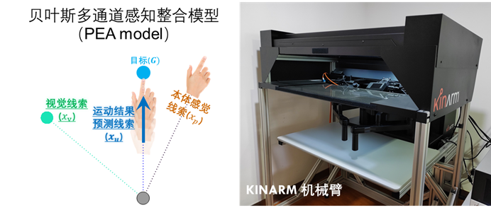 图1. 贝叶斯多通道感知模型和实验设备。左图:模型理论图示。内隐动作学习中手位置估计由三个感知动作信号整合而成,分别为视觉线索(xv),本体感觉线索(xp)和动作结果预测线索(xu)。右图:实验用KINARM可编程机械臂,用于精准测量上肢终点运动轨迹和产生力学反馈。