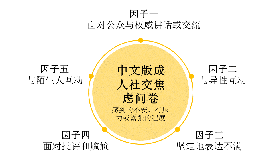 经过中文版修订,并在中国成人群体中进行信效度检验,研究证明,成人社交焦虑问卷中文版在我国成人群体中仍适合原问卷中的5因子结构模型,具有较好的效度和信度,可以用于评估成年群体的社交焦虑症状。