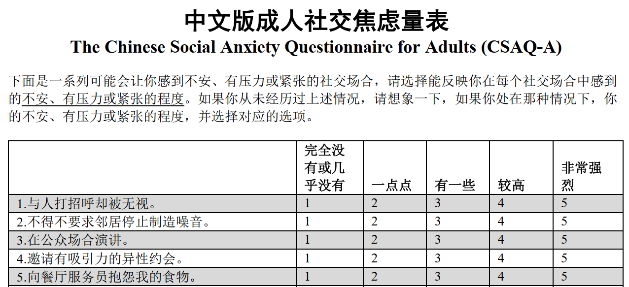 研究者对成人社交焦虑问卷(SAQ-A)进行跨文化引进,并测试其信效度,以形成中文版成人社交焦虑问卷(The Chinese Social Anxiety Questionnaire for Adults, CSAQ-A),作为评估国内成人社交焦虑程度的一个定量工具。