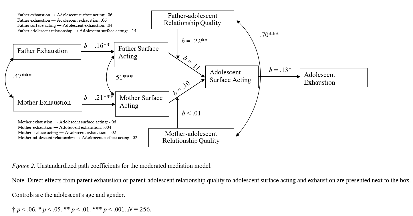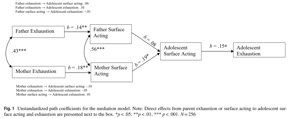 北京大学心理与认知科学学院童佳瑾课题组的研究“Parent-adolescent transmission of emotional exhaustion: Testing a social-cognitive spillover and crossover model”发表于Journal of Business Psychology杂志。文章基于社会认知理论,构建了一个链式中介作用模型,揭示了父母工作倦怠对学生学业倦怠的影响机制。具体地,母亲工作倦怠会增加母亲在家的情绪伪装行为,这种情绪伪装行为被孩子习得之后,带来孩子在学校的学业倦怠。而父亲的工作倦怠似乎并不存在上述影响过程。